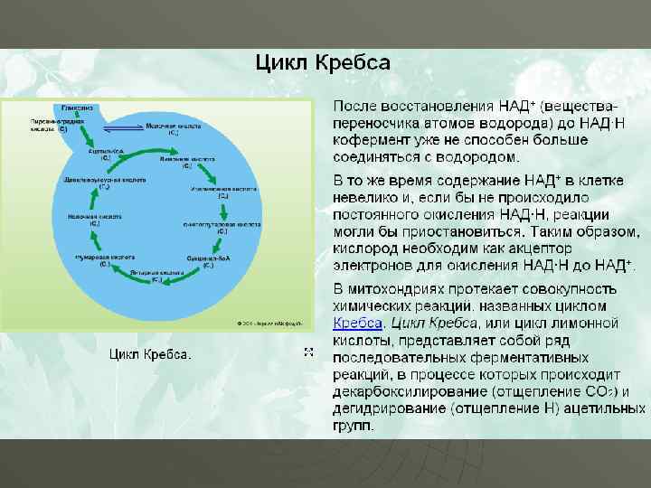 Этапы клеточного дыхания Окислительное декарбоксилирование пировиноградной кислоты При участии сложного ферментного комплекса отщепляется молекула углекислого газа и образуется соединение ацетил-коэнзим А, а также НАДН. Цикл трикарбоновых кислот (цикл Кребса) Ацетил-коэнзим А расщепляется с высвобождением еще одной молекулы углекислого газа, а также образованием АТФ, НАДН и ФАДН. Углекислый газ поступает в кровь и удаляется из организма через органы дыхания. Энергия, запасенная в молекулах НАДН и ФАДН, используется для синтеза АТФ на следующем этапе клеточного дыхания. Окислительное фосфорилирование Многоступенчатый перенос электронов от восстановленных форм НАДН и ФАДН по цепи транспорта электронов, встроенной во внутреннюю мембрану митохондрий, на конечный акцептор кислород, сопряженный с синтезом АТФ.