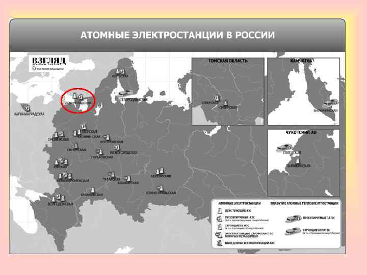 В 2010 г. АЭС России выработали 170, 1 млрд. к. Втч электроэнергии, что составляет 100, 5% от задания ФСТ России. Доля атомной генерации в общем энергобалансе России около 16 %. Высокое значение атомная энергетика имеет в европейской части России и особенно на северо- западе, где выработка на АЭС достигает 42 %.