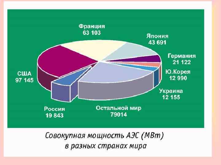 ЯДЕРНАЯ ЭНЕРГЕТИКА Атомные электростанции (АЭС). В России 10 действующих АЭС, на которых функционирует 30 энергоблоков. Крупнейшими атомными электростанциями мира являются «Фукусима» в Японии - 9 млн к. Вт; «Брюс» в Канаде - 7 млн к. Вт; «Гравлин» во Франции - 5, 7 млн к. Вт.