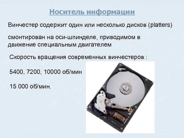 Носитель информации Винчестер содержит один или несколько дисков (platters) смонтирован на оси-шпинделе, приводимом в движение специальным двигателем Скорость вращения современных винчестеров : 5400, 7200, 10000 об/мин 15 000 об/мин.