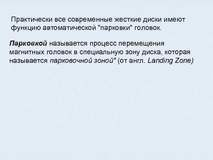 Практически все современные жесткие диски имеют функцию автоматической "парковки" головок. Парковкой называется процесс перемещения магнитных головок в специальную зону диска, которая называется парковочной зоной" (от англ. Landing Zone)