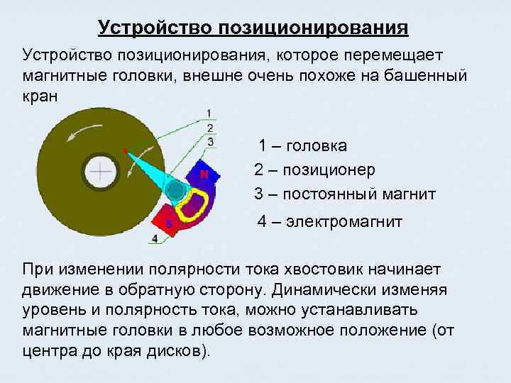 Устройство позиционирования, которое перемещает магнитные головки, внешне очень похоже на башенный кран 1 – головка 2 – позиционер 3 – постоянный магнит 4 – электромагнит При изменении полярности тока хвостовик начинает движение в обратную сторону. Динамически изменяя уровень и полярность тока, можно устанавливать магнитные головки в любое возможное положение (от центра до края дисков).