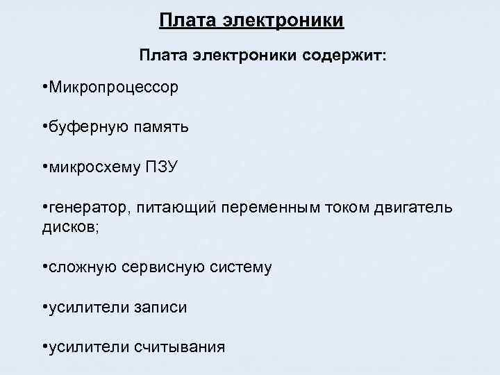 Плата электроники содержит: • Микропроцессор • буферную память • микросхему ПЗУ • генератор, питающий переменным током двигатель дисков; • сложную сервисную систему • усилители записи • усилители считывания