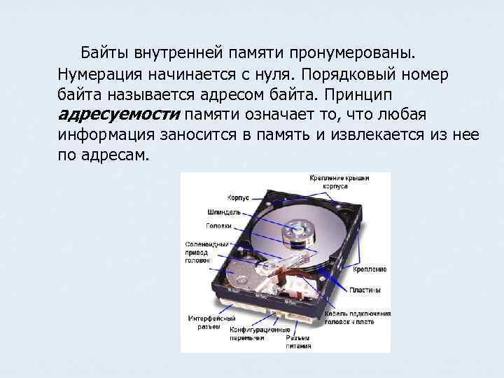 Байты внутренней памяти пронумерованы. Нумерация начинается с нуля. Порядковый номер байта называется адресом байта. Принцип адресуемости памяти означает то, что любая информация заносится в память и извлекается из нее по адресам.