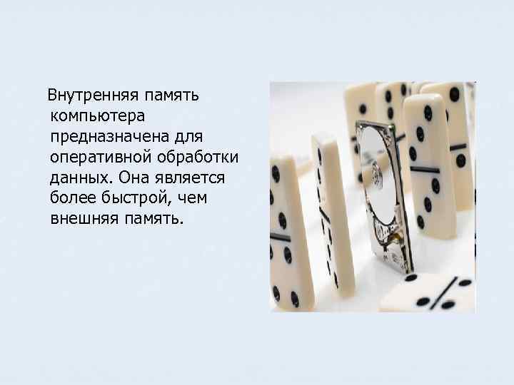 Внутренняя память компьютера предназначена для оперативной обработки данных. Она является более быстрой, чем внешняя память.