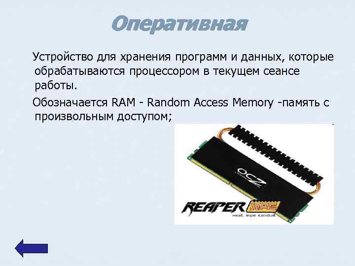 Оперативная Устройство для хранения программ и данных, которые обрабатываются процессором в текущем сеансе работы. Обозначается RAM - Random Access Memory -память с произвольным доступом;