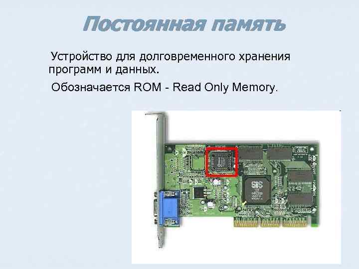 Постоянная память Устройство для долговременного хранения программ и данных. Обозначается ROM - Read Only Memory.