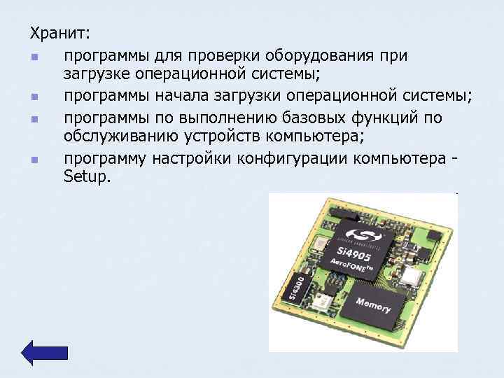 Хранит: n программы для проверки оборудования при загрузке операционной системы; n программы начала загрузки операционной системы; n программы по выполнению базовых функций по обслуживанию устройств компьютера; n программу настройки конфигурации компьютера Setup.