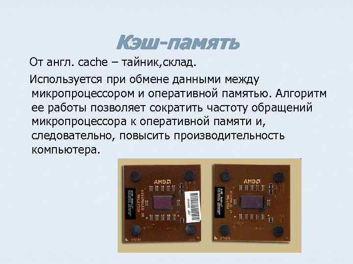 Кэш-память От англ. caсhe – тайник, склад. Используется при обмене данными между микропроцессором и оперативной памятью. Алгоритм ее работы позволяет сократить частоту обращений микропроцессора к оперативной памяти и, следовательно, повысить производительность компьютера.