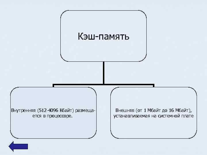 Кэш-память Внутренняя (512 -4096 Кбайт) размещается в процессоре. Внешняя (от 1 Мбайт до 16 Мбайт), устанавливаемая на системной плате