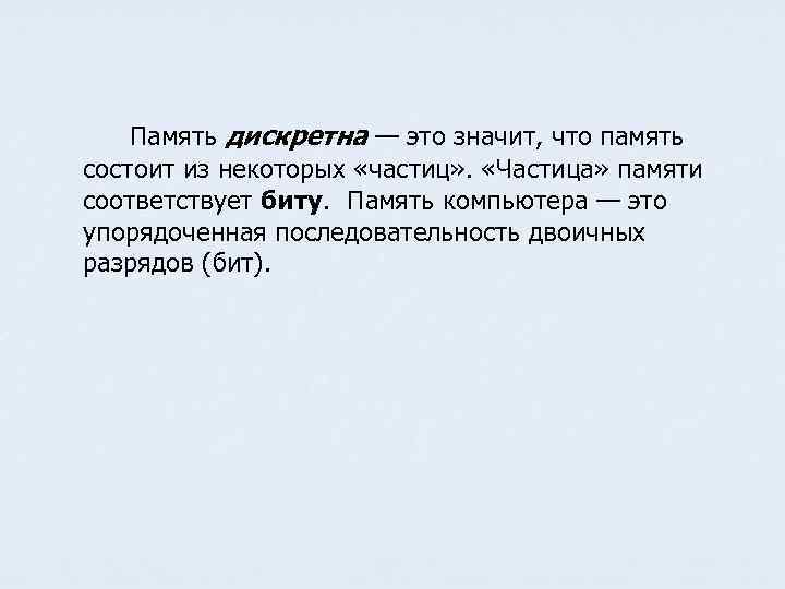 Память дискретна — это значит, что память состоит из некоторых «частиц» . «Частица» памяти соответствует биту. Память компьютера — это упорядоченная последовательность двоичных разрядов (бит).
