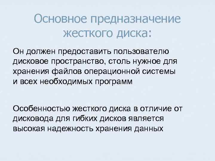Основное предназначение жесткого диска: Он должен предоставить пользователю дисковое пространство, столь нужное для хранения файлов операционной системы и всех необходимых программ Особенностью жесткого диска в отличие от дисковода для гибких дисков является высокая надежность хранения данных