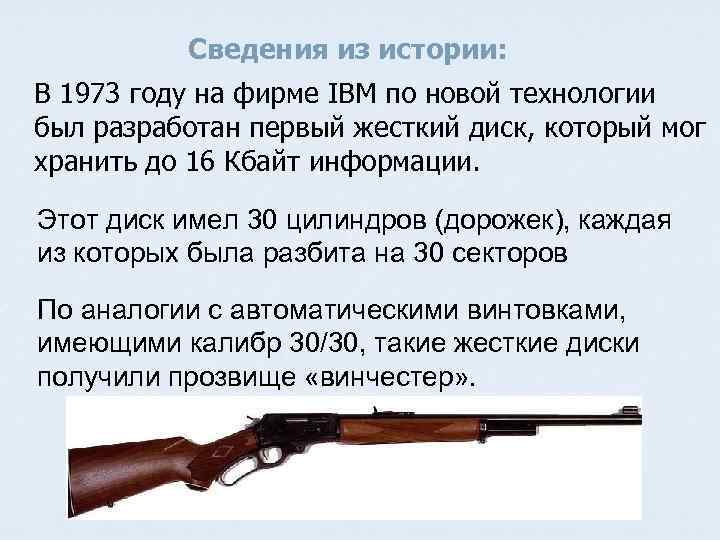 Сведения из истории: В 1973 году на фирме IBM по новой технологии был разработан первый жесткий диск, который мог хранить до 16 Кбайт информации. Этот диск имел 30 цилиндров (дорожек), каждая из которых была разбита на 30 секторов По аналогии с автоматическими винтовками, имеющими калибр 30/30, такие жесткие диски получили прозвище «винчестер» .