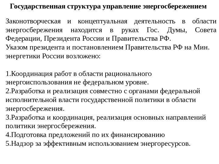 Государственная структура управление энергосбережением Законотворческая и концептуальная деятельность в области энергосбережения находится в руках Гос. Думы, Совета Федерации, Президента России и Правительства РФ. Указом президента и постановлением Правительства РФ на Мин. энергетики России возложено: 1. Координация работ в области рационального энергоиспользования не федеральном уровне. 2. Разработка и реализация совместно с органами федеральной исполнительной власти государственной политики в области энергосбережения. 3. Разработка и координация, реализация основных направлений политики энергосбережения. 4. Подготовка предложений по их финансированию 5. Надзор за эффективным использованием энергоресурсов.