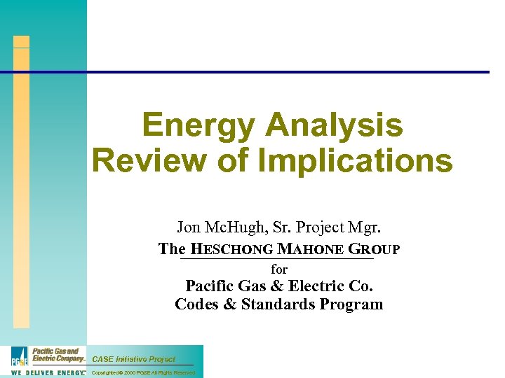Energy Analysis Review of Implications Jon Mc. Hugh, Sr. Project Mgr. The HESCHONG MAHONE GROUP for Pacific Gas & Electric Co. Codes & Standards Program CASE Initiative Project Copyrighted © 2000 PG&E All Rights Reserved