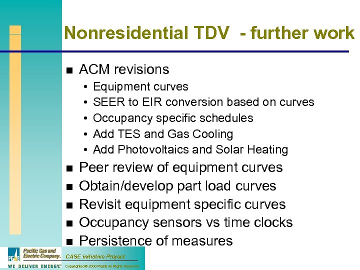 Residential TDV - further work TDV duct efficiency Refined water heater model SEER to EIR conversion Heat pump sizing - resistance strip contribution to winter peak Thermostat schedules - especially for heat pumps CASE Initiative Project Copyrighted © 2000 PG&E All Rights Reserved