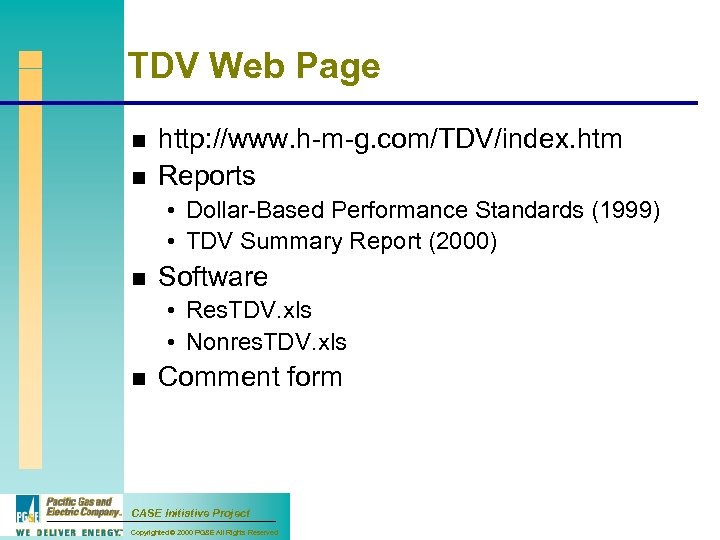 TDV Web Page http: //www. h-m-g. com/TDV/index. htm Reports • Dollar-Based Performance Standards (1999) • TDV Summary Report (2000) Software • Res. TDV. xls • Nonres. TDV. xls Comment form CASE Initiative Project Copyrighted © 2000 PG&E All Rights Reserved