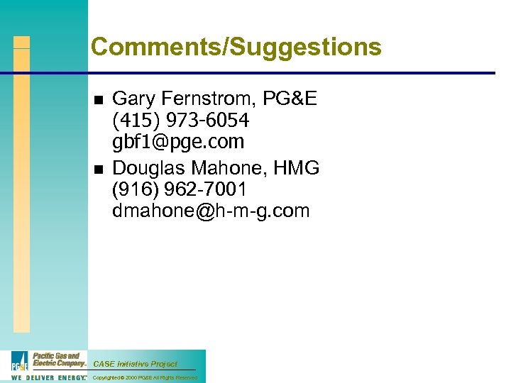 Comments/Suggestions Gary Fernstrom, PG&E (415) 973 -6054 gbf 1@pge. com Douglas Mahone, HMG (916) 962 -7001 dmahone@h-m-g. com CASE Initiative Project Copyrighted © 2000 PG&E All Rights Reserved