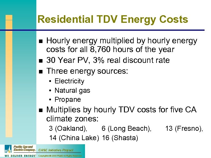 Residential Energy Model 1761 SF house with equal glazing distribution in each direction Hourly energy values from TDV research version of MICROPAS A/C and Heat Pump Efficiency adjusted with respect to ambient temperature DHW loads allocated to 4 load profiles from PG&E load survey data • weekday vs. weekend • summer vs winter CASE Initiative Project Copyrighted © 2000 PG&E All Rights Reserved