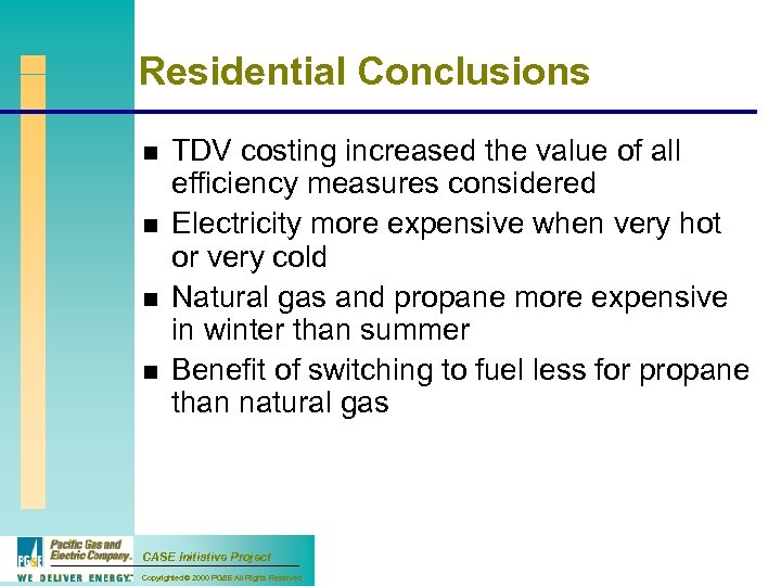 Residential Conclusions TDV costing increased the value of all efficiency measures considered Electricity more expensive when very hot or very cold Natural gas and propane more expensive in winter than summer Benefit of switching to fuel less for propane than natural gas CASE Initiative Project Copyrighted © 2000 PG&E All Rights Reserved