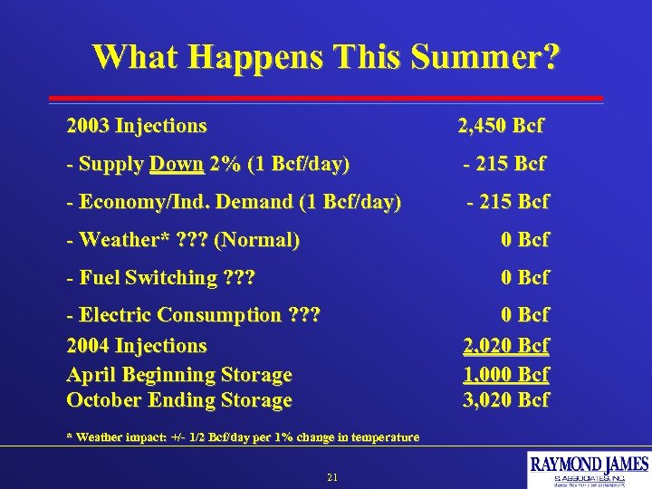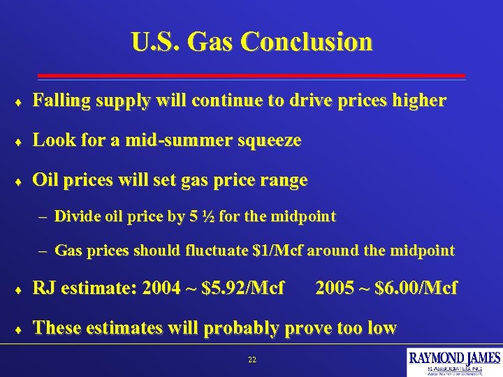 What Happens This Summer? 2003 Injections 2, 450 Bcf - Supply Down 2% (1 Bcf/day) - 215 Bcf - Economy/Ind. Demand (1 Bcf/day) - 215 Bcf - Weather* ? ? ? (Normal) 0 Bcf - Fuel Switching ? ? ? 0 Bcf - Electric Consumption ? ? ? 2004 Injections April Beginning Storage October Ending Storage 0 Bcf 2, 020 Bcf 1, 000 Bcf 3, 020 Bcf * Weather impact: +/- 1/2 Bcf/day per 1% change in temperature 21