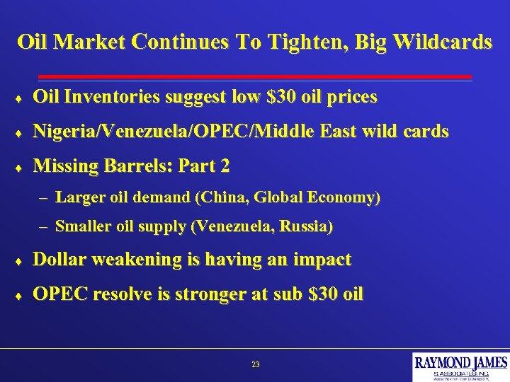 U. S. Gas Conclusion ¨ Falling supply will continue to drive prices higher ¨ Look for a mid-summer squeeze ¨ Oil prices will set gas price range – Divide oil price by 5 ½ for the midpoint – Gas prices should fluctuate $1/Mcf around the midpoint ¨ RJ estimate: 2004 ~ $5. 92/Mcf ¨ These estimates will probably prove too low 22 2005 ~ $6. 00/Mcf