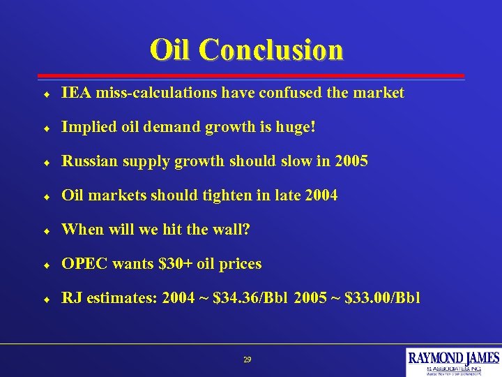 Oil Conclusion ¨ IEA miss-calculations have confused the market ¨ Implied oil demand growth is huge! ¨ Russian supply growth should slow in 2005 ¨ Oil markets should tighten in late 2004 ¨ When will we hit the wall? ¨ OPEC wants $30+ oil prices ¨ RJ estimates: 2004 ~ $34. 36/Bbl 2005 ~ $33. 00/Bbl 29