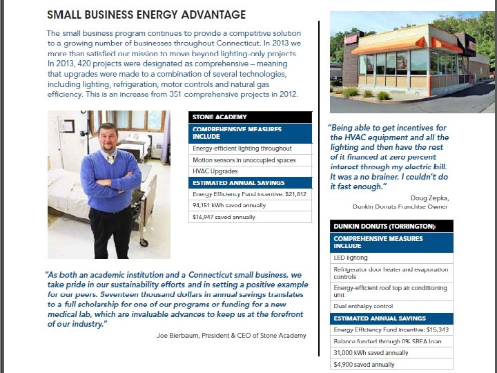 Statistics 2000 - 2014 • Over 4, 952 Installed Small Business Projects • Averaging between 20% to 25% reduction • 994 m Lifetime k. Wh Saved = • > 614, 000 TONS of REDUCED CARBON DIOXIDE! • $19. 8 m Incentives Paid by Connecticut Energy Efficiency Fund • $39. 2 m in 0% Financed Loans