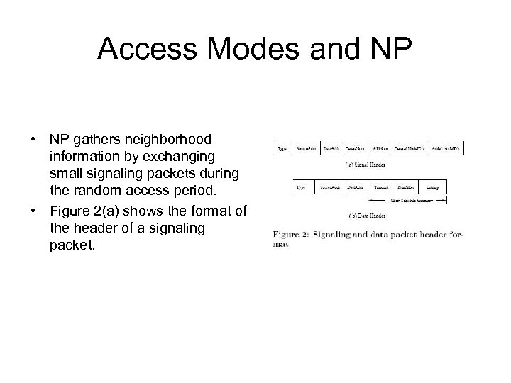 Access Modes and NP • NP gathers neighborhood information by exchanging small signaling packets during the random access period. • Figure 2(a) shows the format of the header of a signaling packet.