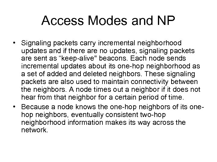 Access Modes and NP • Signaling packets carry incremental neighborhood updates and if there are no updates, signaling packets are sent as “keep-alive" beacons. Each node sends incremental updates about its one-hop neighborhood as a set of added and deleted neighbors. These signaling packets are also used to maintain connectivity between the neighbors. A node times out a neighbor if it does not hear from that neighbor for a certain period of time. • Because a node knows the one-hop neighbors of its onehop neighbors, eventually consistent two-hop neighborhood information makes its way across the network.