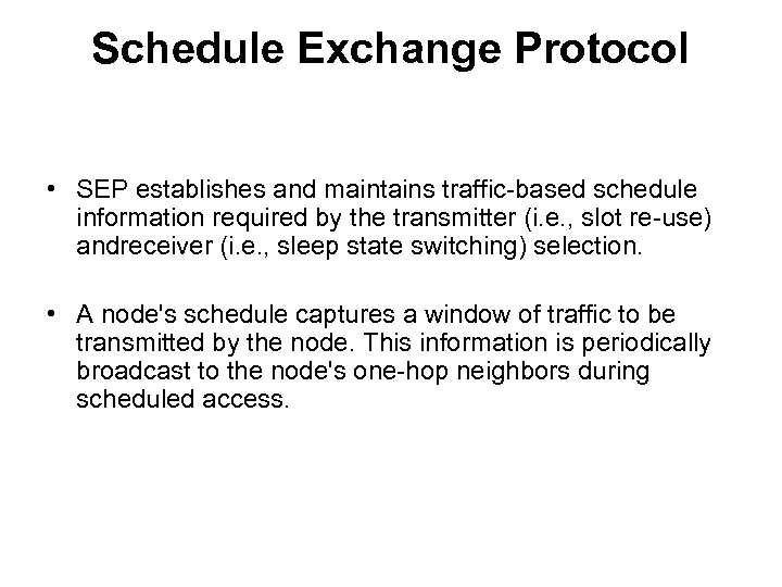 Schedule Exchange Protocol • SEP establishes and maintains traffic-based schedule information required by the transmitter (i. e. , slot re-use) andreceiver (i. e. , sleep state switching) selection. • A node's schedule captures a window of traffic to be transmitted by the node. This information is periodically broadcast to the node's one-hop neighbors during scheduled access.