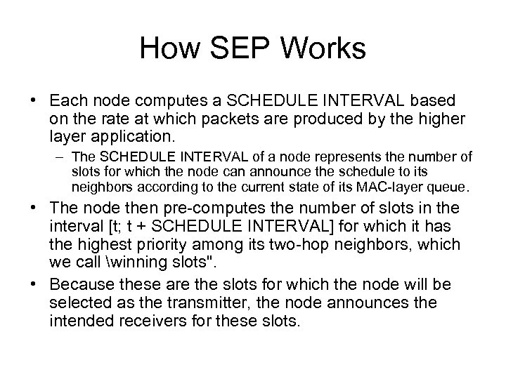 How SEP Works • Each node computes a SCHEDULE INTERVAL based on the rate at which packets are produced by the higher layer application. – The SCHEDULE INTERVAL of a node represents the number of slots for which the node can announce the schedule to its neighbors according to the current state of its MAC-layer queue. • The node then pre-computes the number of slots in the interval [t; t + SCHEDULE INTERVAL] for which it has the highest priority among its two-hop neighbors, which we call winning slots". • Because these are the slots for which the node will be selected as the transmitter, the node announces the intended receivers for these slots.