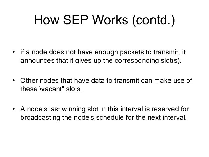How SEP Works (contd. ) • if a node does not have enough packets to transmit, it announces that it gives up the corresponding slot(s). • Other nodes that have data to transmit can make use of these vacant" slots. • A node's last winning slot in this interval is reserved for broadcasting the node's schedule for the next interval.