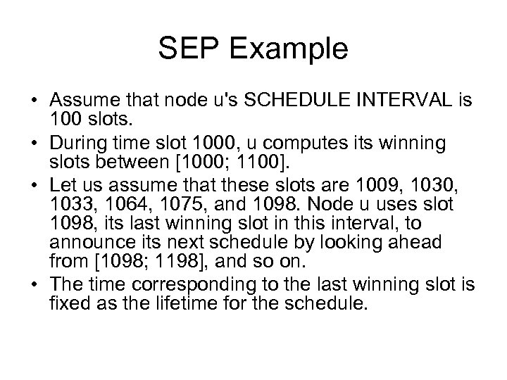 SEP Example • Assume that node u's SCHEDULE INTERVAL is 100 slots. • During time slot 1000, u computes its winning slots between [1000; 1100]. • Let us assume that these slots are 1009, 1030, 1033, 1064, 1075, and 1098. Node u uses slot 1098, its last winning slot in this interval, to announce its next schedule by looking ahead from [1098; 1198], and so on. • The time corresponding to the last winning slot is fixed as the lifetime for the schedule.