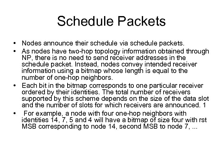 Schedule Packets • Nodes announce their schedule via schedule packets. • As nodes have two-hop topology information obtained through NP, there is no need to send receiver addresses in the schedule packet. Instead, nodes convey intended receiver information using a bitmap whose length is equal to the number of one-hop neighbors. • Each bit in the bitmap corresponds to one particular receiver ordered by their identities. The total number of receivers supported by this scheme depends on the size of the data slot and the number of slots for which receivers are announced. 1 • For example, a node with four one-hop neighbors with identities 14, 7, 5 and 4 will have a bitmap of size four with rst MSB corresponding to node 14, second MSB to node 7, . . .