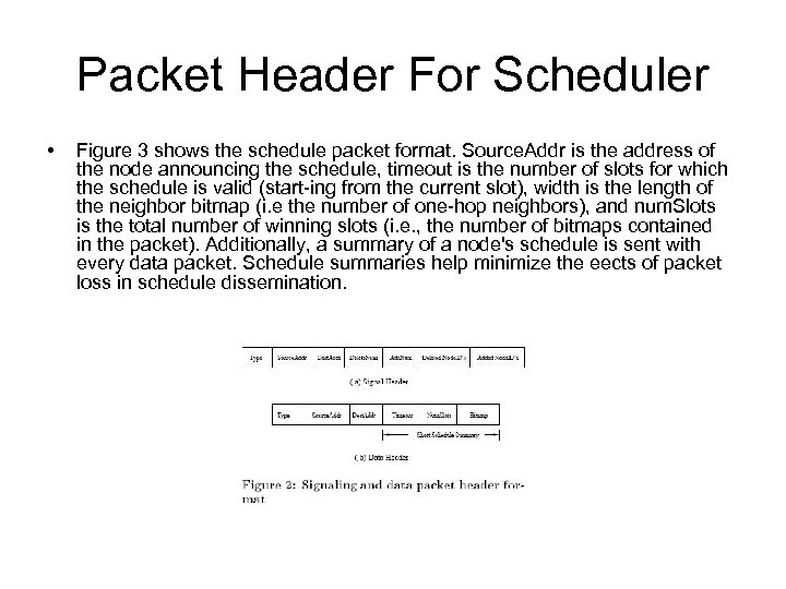 Packet Header For Scheduler • Figure 3 shows the schedule packet format. Source. Addr is the address of the node announcing the schedule, timeout is the number of slots for which the schedule is valid (start-ing from the current slot), width is the length of the neighbor bitmap (i. e the number of one-hop neighbors), and num. Slots is the total number of winning slots (i. e. , the number of bitmaps contained in the packet). Additionally, a summary of a node's schedule is sent with every data packet. Schedule summaries help minimize the eects of packet loss in schedule dissemination.