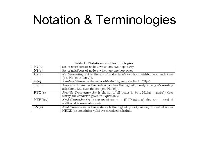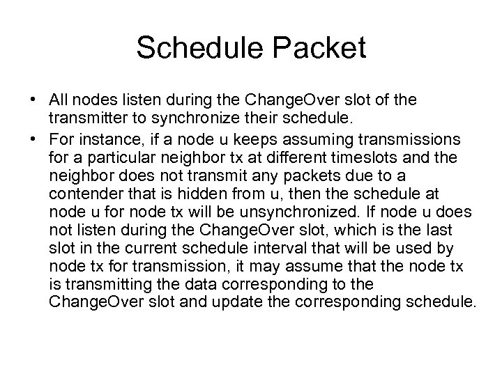 Schedule Packet • All nodes listen during the Change. Over slot of the transmitter to synchronize their schedule. • For instance, if a node u keeps assuming transmissions for a particular neighbor tx at different timeslots and the neighbor does not transmit any packets due to a contender that is hidden from u, then the schedule at node u for node tx will be unsynchronized. If node u does not listen during the Change. Over slot, which is the last slot in the current schedule interval that will be used by node tx for transmission, it may assume that the node tx is transmitting the data corresponding to the Change. Over slot and update the corresponding schedule.