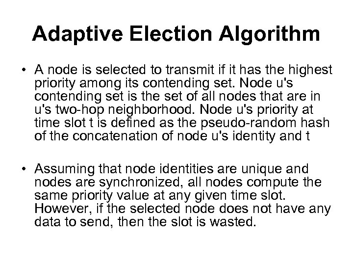 Adaptive Election Algorithm • A node is selected to transmit if it has the highest priority among its contending set. Node u's contending set is the set of all nodes that are in u's two-hop neighborhood. Node u's priority at time slot t is defined as the pseudo-random hash of the concatenation of node u's identity and t • Assuming that node identities are unique and nodes are synchronized, all nodes compute the same priority value at any given time slot. However, if the selected node does not have any data to send, then the slot is wasted.