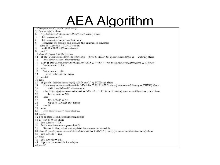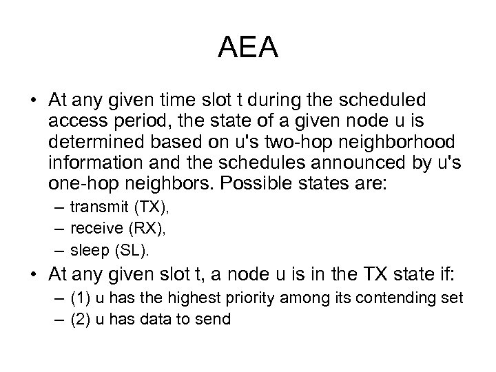AEA • Each node executes AEA to decide its current state ( TX, RX, or SL) based on current node priorities (within its two -hop neighborhood) and also on the announced schedules from one-hop neighbors.