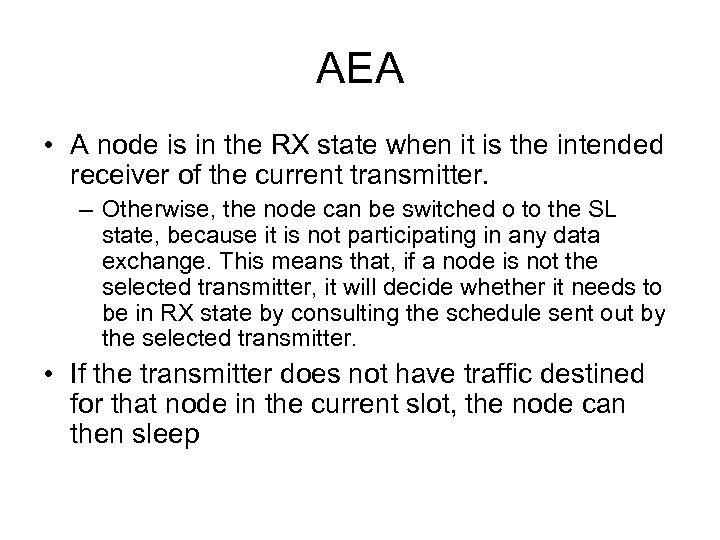 AEA • A node is in the RX state when it is the intended receiver of the current transmitter. – Otherwise, the node can be switched o to the SL state, because it is not participating in any data exchange. This means that, if a node is not the selected transmitter, it will decide whether it needs to be in RX state by consulting the schedule sent out by the selected transmitter. • If the transmitter does not have traffic destined for that node in the current slot, the node can then sleep