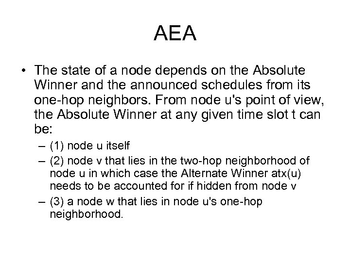 AEA • The state of a node depends on the Absolute Winner and the announced schedules from its one-hop neighbors. From node u's point of view, the Absolute Winner at any given time slot t can be: – (1) node u itself – (2) node v that lies in the two-hop neighborhood of node u in which case the Alternate Winner atx(u) needs to be accounted for if hidden from node v – (3) a node w that lies in node u's one-hop neighborhood.