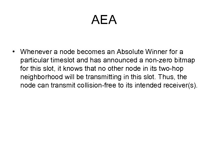 AEA • Whenever a node becomes an Absolute Winner for a particular timeslot and has announced a non-zero bitmap for this slot, it knows that no other node in its two-hop neighborhood will be transmitting in this slot. Thus, the node can transmit collision-free to its intended receiver(s).