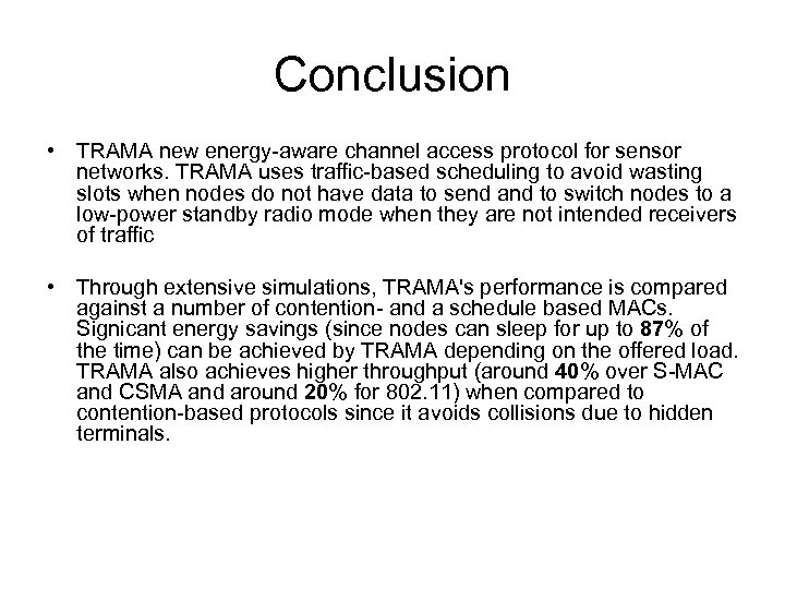 Conclusion • TRAMA new energy-aware channel access protocol for sensor networks. TRAMA uses traffic-based scheduling to avoid wasting slots when nodes do not have data to send and to switch nodes to a low-power standby radio mode when they are not intended receivers of traffic • Through extensive simulations, TRAMA's performance is compared against a number of contention- and a schedule based MACs. Signicant energy savings (since nodes can sleep for up to 87% of the time) can be achieved by TRAMA depending on the offered load. TRAMA also achieves higher throughput (around 40% over S-MAC and CSMA and around 20% for 802. 11) when compared to contention-based protocols since it avoids collisions due to hidden terminals.