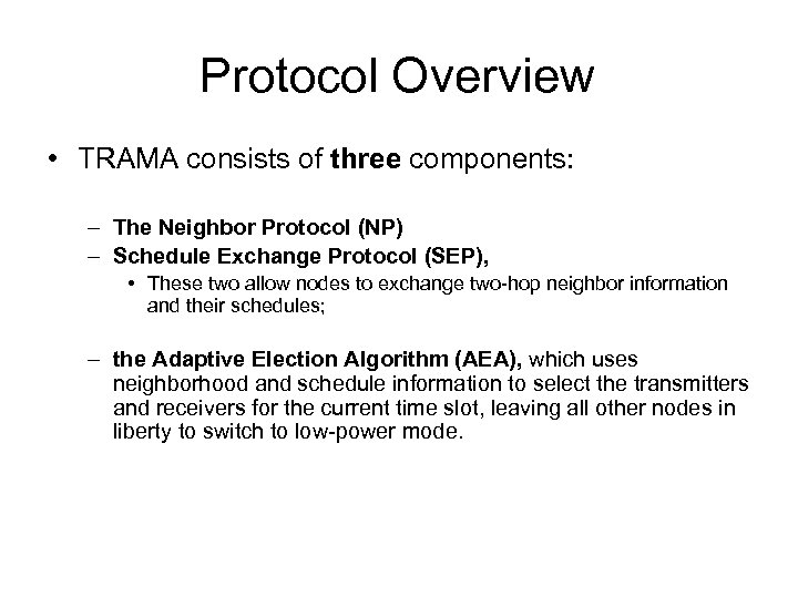 Protocol Overview • TRAMA consists of three components: – The Neighbor Protocol (NP) – Schedule Exchange Protocol (SEP), • These two allow nodes to exchange two-hop neighbor information and their schedules; – the Adaptive Election Algorithm (AEA), which uses neighborhood and schedule information to select the transmitters and receivers for the current time slot, leaving all other nodes in liberty to switch to low-power mode.