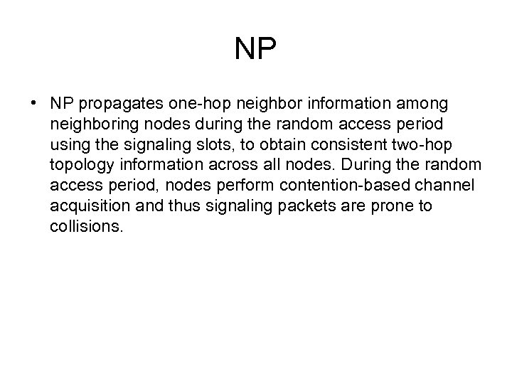 NP • NP propagates one-hop neighbor information among neighboring nodes during the random access period using the signaling slots, to obtain consistent two-hop topology information across all nodes. During the random access period, nodes perform contention-based channel acquisition and thus signaling packets are prone to collisions.