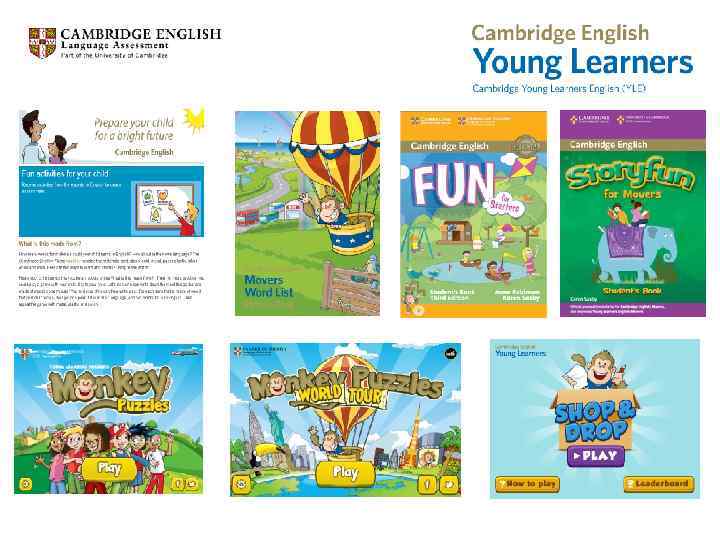 Cambridge English: Young Learners tests: • assess skills through a series of tasks that are fun and as meaningful as possible in the child’s world • do not ‘measure’ the child as a pass or fail candidate • are a motivating first step in Cambridge English exams