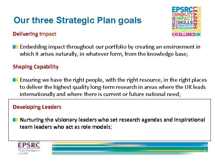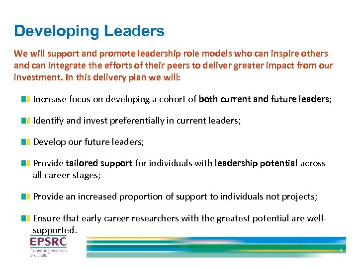 Our three Strategic Plan goals Delivering Impact Embedding impact throughout our portfolio by creating an environment in which it arises naturally, in whatever form, from the knowledge base; Shaping Capability Ensuring we have the right people, with the right resource, in the right places to deliver the highest quality long-term research in areas where the UK leads internationally and where there is current or future national need; Developing Leaders Nurturing the visionary leaders who set research agendas and inspirational team leaders who act as role models; 3