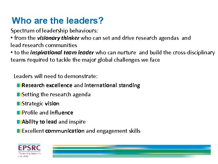 Who are the leaders? Spectrum of leadership behaviours: • from the visionary thinker who can set and drive research agendas and lead research communities • to the inspirational team leader who can nurture and build the cross-disciplinary teams required to tackle the major global challenges we face Leaders will need to demonstrate: Research excellence and international standing Setting the research agenda Strategic vision Profile and influence Ability to lead and inspire Excellent communication and engagement skills