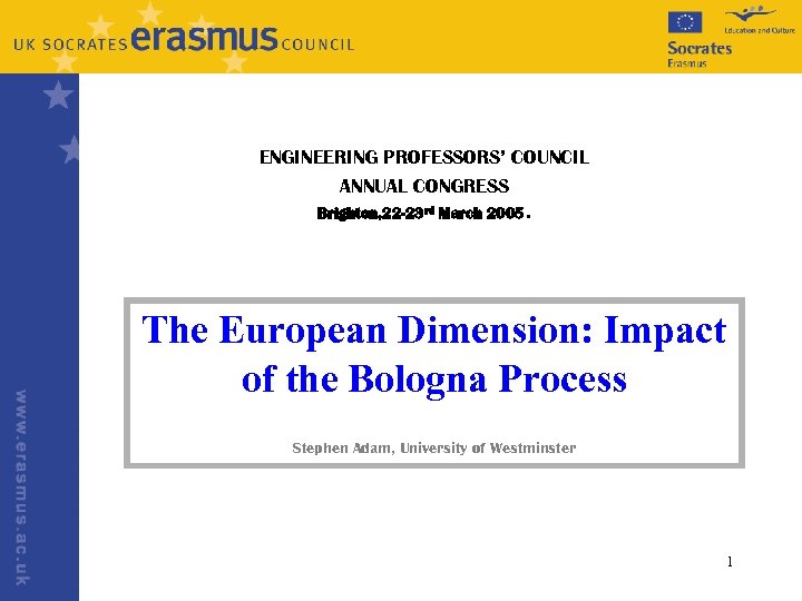 ENGINEERING PROFESSORS’ COUNCIL ANNUAL CONGRESS Brighton, 22 -23 rd March 2005. The European Dimension: Impact of the Bologna Process Stephen Adam, University of Westminster 1