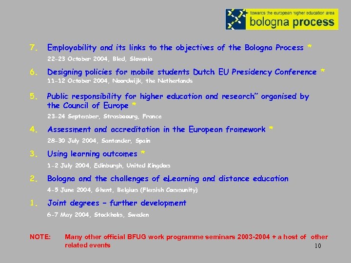 7. Employability and its links to the objectives of the Bologna Process * 22 -23 October 2004, Bled, Slovenia 6. Designing policies for mobile students Dutch EU Presidency Conference * 5. Public responsibility for higher education and research” organised by the Council of Europe * 11 -12 October 2004, Noordwijk, the Netherlands 23 -24 September, Strasboourg, France 4. Assessment and accreditation in the European framework * 28 -30 July 2004, Santander, Spain 3. Using learning outcomes * 1 -2 July 2004, Edinburgh, United Kingdom 2. Bologna and the challenges of e. Learning and distance education 4 -5 June 2004, Ghent, Belgium (Flemish Community) 1. Joint degrees – further development 6 -7 May 2004, Stockholm, Sweden NOTE: Many other official BFUG work programme seminars 2003 -2004 + a host of other related events 10